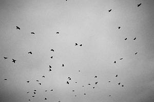 Flying crows in the skies of Coi, Dolemites Mountains, Italy